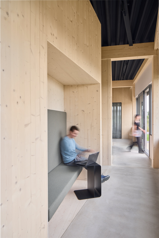 Die Innenräume wurden vollständig von unserem Team arc+ gestaltet. Multifunktionale Möbel verbinden Sitzflächen, Stauraum und Ablagen. Ein Highlight ist die Meetingzone mit Lamellendesign, das visuelle und räumliche Übergänge schafft. Der flexible Pausenraum kann durch Vorhänge zwischen Offenheit und Rückzug wechseln und bietet so einen wandelbaren Ort des Austauschs.