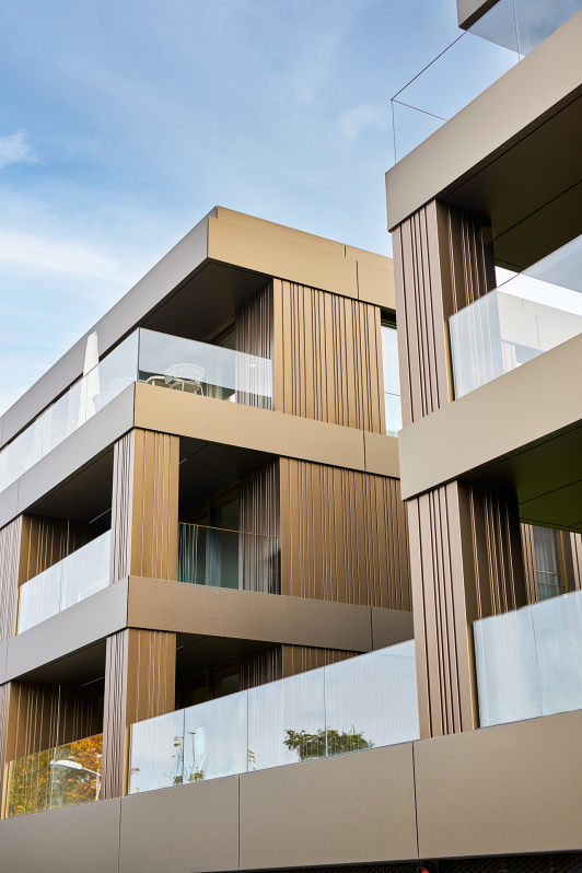 Es sind 15 Wohneinheiten von der Zwei-Zimmer-Wohnung bis zum Penthouse-Loft entstanden. Die Anlage wurde auf einem verbindenden Sockelgeschoss in zwei Baukörper aufgeteilt. Die Fassadengestaltung kombiniert innovative Materialien mit einer präzisen Verarbeitung. Unsichtbar befestigte Alucobond-Paneele in Verbindung mit profilierten Fassadentafeln erzeugen einen changierenden Bronzeton. Ergänzt durch eloxiertes Streckmetall entsteht eine dynamische Interaktion von Licht und Struktur.