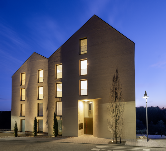 Zwei Satteldächer und unterschiedliche Texturen der Putzfassaden gliedern das Objekt optisch in zwei Teile. Das Gebäude steht selbstbewusst an der Straßenkante und bildet den Abschluss der Turnhallenstraßen. Stadtseitig zeigt sich eine klare Anordnung der Lochfenster, nach Westen erschließen die Balkone großzügig den Naturraum.