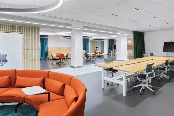 Eines der vielen erfolgreich umgesetzten Projekte am Stammsitz von Hansgrohe in Schiltach. Auf 1.500 m² wurde in Zusammenarbeit mit Vitra ein agiles und hochflexibles Bürokonzept auf Basis der Bedürfnisse der Mitarbeiter:innen umgesetzt.
