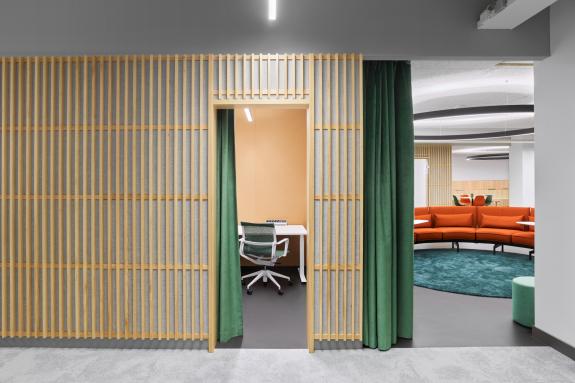 Die Nähe von Hansgrohe zur Talaue der Kinzig wurde in den Details aufgenommen. Rundungen prägen den Raum und sind eine Reminiszenz an den Bach. Sie geben den Räumen Dynamik und Weichheit.