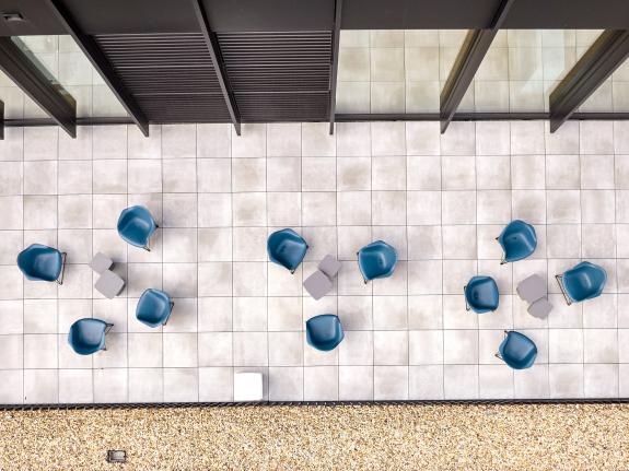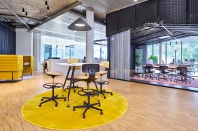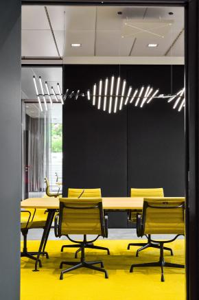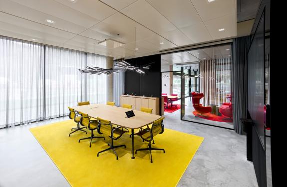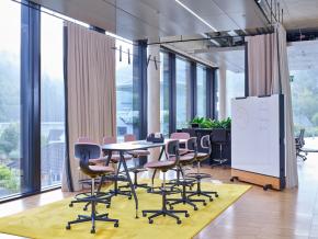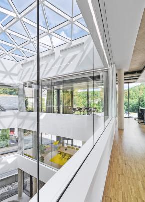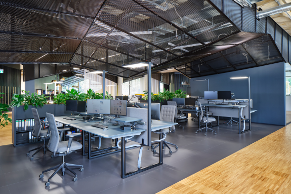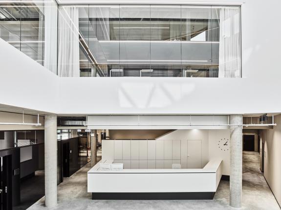 Das Raumkonzept erstreckt sich über vier Etagen mit insgesamt 4.000 m² Fläche und bietet Raum für 180 Arbeitsplätze. Der Fokus liegt auf großen und offenen Flächen, die Abteilungsgrenzen auflösen und interdisziplinäre Zusammenarbeit fördern. Flexible Raumstrukturen ermöglichen eine schnelle Anpassung an zukünftige Entwicklungen, ohne dass aufwendige Umbauten nötig sind. Der zentrale Treppenraum mit Split-Level-Elementen und großflächigen Lufträumen schafft eine Verbindung zwischen den Geschossen und sorgt für eine lichtdurchflutete Atmosphäre.