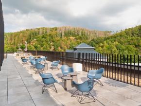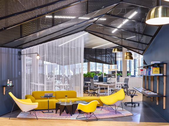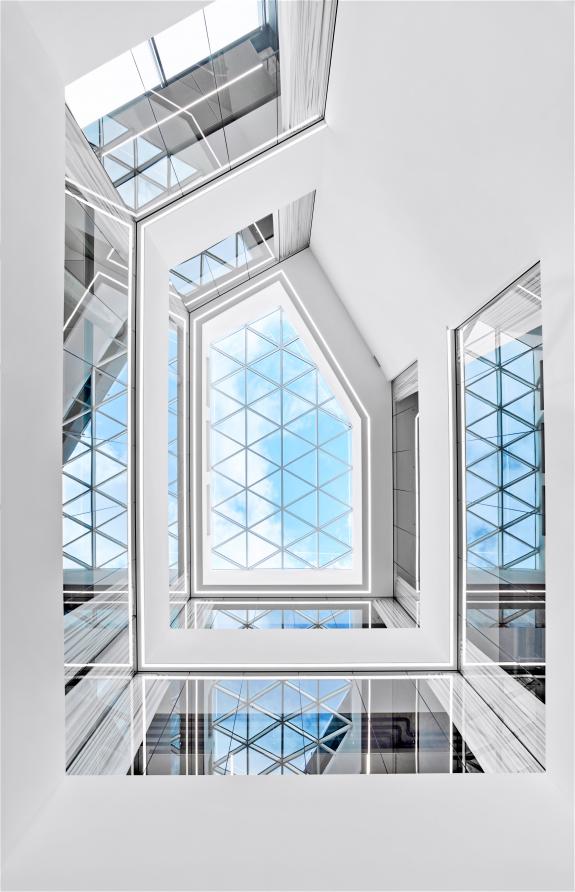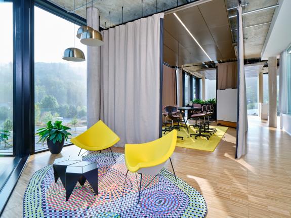 . Die Gestaltung des Innenraums greift die charakteristische Giebellandschaft Freudenbergs auf und integriert sie in Form von Deckenskulpturen und architektonischen Elementen. Die Büroflächen sind offen und flexibel konzipiert, um spontane Zusammenarbeit und agile Teamarbeit zu fördern. Marktplätze, Lounges, Bibliotheken sowie Rückzugs- und Besprechungszonen bieten vielfältige Arbeitsmöglichkeiten und unterstützen eine moderne Unternehmenskultur ohne starre Hierarchien.