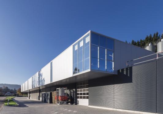 Die Anlieferung, Materialvorhaltung und Anordnung der Produktionsabläufe sind perfekt auf die örtlichen Gegebenheiten abgestimmt. Bestehende Anlagenteile wurden an die neue Produktion angebunden. Die Architektur hat bestehende Gestaltungsmerkmale der letzten Erweiterungen aufgenommen und den gesamten Gebäudekomplex zu einem großen Ganzen verbunden. Durch die Staffelung und gestalterische Teilung der Fassaden passt sich das große Volumen in die Topografie ein.