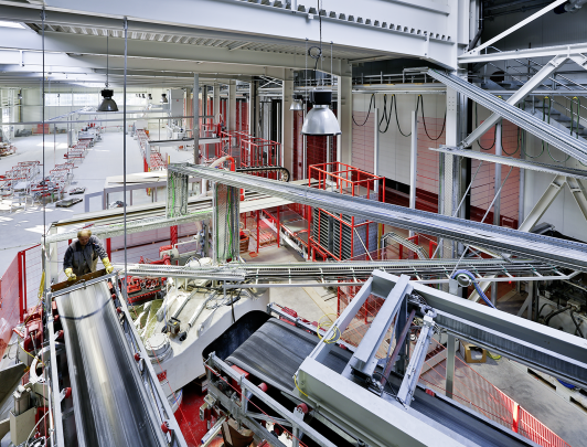 Der Grundriss ist der Rahmen für die bis ins Detail durchdachten Herstellungsprozesse der Betonplatten. Mit minimalem Ausschuss und geringstem Personaleinsatz an der Anlage werden die Platten gegossen, gepresst, gehärtet, nachbearbeitet und palettiert. Dabei wird aus der Not eine Tugend: Die Gravitation wird zum Verbündeten. Die Rohstoffe werden von den Lkws auf der Rückseite der Halle oben am Hang direkt in die Schüttgutbehälter und Silos gefüllt. Das Material muss so nicht noch mal nach oben in die Mischanlagen gefördert werden.