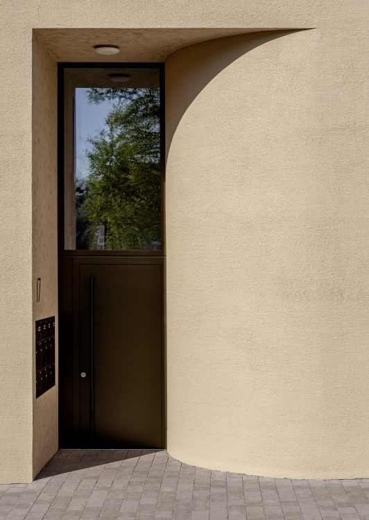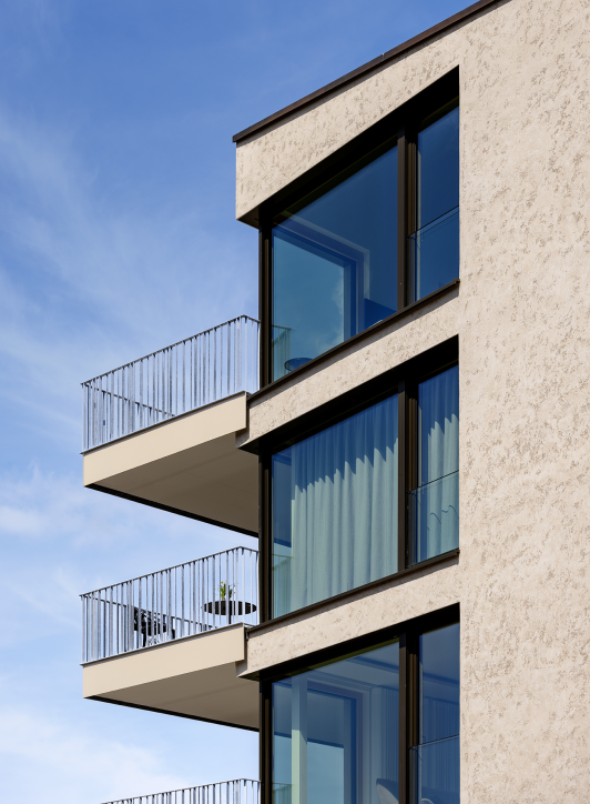 Zwei Satteldächer und unterschiedliche Texturen der Putzfassaden gliedern das Objekt optisch in zwei Teile. Das Gebäude steht selbstbewusst an der Straßenkante und bildet den Abschluss der Turnhallenstraßen. Stadtseitig zeigt sich eine klare Anordnung der Lochfenster, nach Westen erschließen die Balkone großzügig den Naturraum.